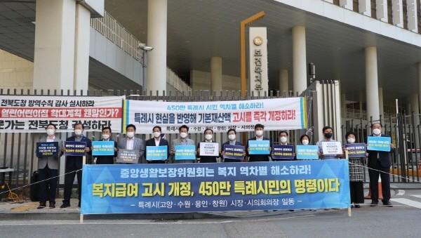 용인시의회(의장 김기준)는 27일 오전 10시 세종특별자치시 보건복지부 앞에서 김기준 의장과 의원들, 특례시 시장 및 의장들과 함께 사회복지 특례권한 확보를 위한 기본재산액 고시 개정을 촉구하는 4개 특례시 릴레이 1인 시위를 진행했다. 용인시의회 사회복지…
