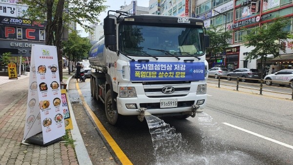 용인시는 28일 연일 이어지는 무더위로 시민들이 피해를 입지 않도록 다양한 폭염 대응책을 마련해 시행하고 있다고 밝혔다. 폭염 대비 도심 도로 살수차 운행 모습 시는 오는 9월 30일까지를 폭염 대책 기간으로 정해 피해 발생 시 신속히 대응할 수 있도…