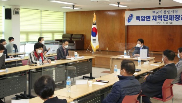 백군기 용인시장은 19일 처인구 백암면 행정복지센터 대회의실에서 백암면 지역단체장・시의원들과 함께 현안사항 논의를 위한 간담회를 가졌다. 백암면 지역단체장 간담회 (1)이날 간담회엔 백군기 시장을 비롯해 박원동, 김진석 용인시의회 의원, 함창수 이장협의회장, 김용석 주민자치위…