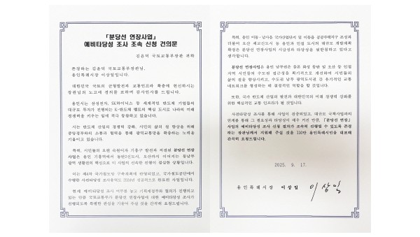 용인특례시(시장 이상일)는 17일 김윤덕 국토교통부 장관에게 ‘분당선 연장사업’과 ‘경기남부광역철도 사업’의 조속한 추진을 요청하는 이상일 시장의 건의문을 전달했다고 18일 밝혔다.이상일 용인특례시장이 김윤덕 국토교통부 장관에게 전달한 '경기남부광역철도 신설 사업' 적극 추진 요청 건의…