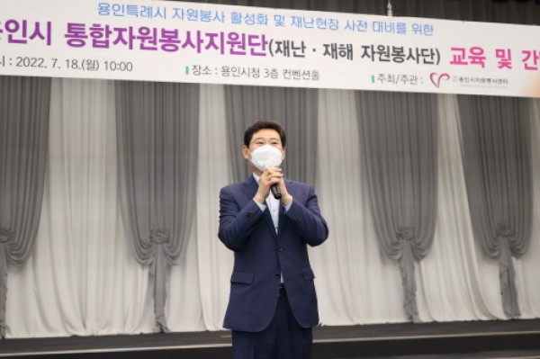 용인시자원봉사센터(이사장 이상일)가 18일 재난현장 사전 대비를 위한 통합자원봉사단 교육 및 간담회를 진행했다.이상일 용인시장이 18일 열린 용인시통합자원봉사단 교육 및 간담회에 참석해 인사말을 하고 있다. 이날 용인시청 컨벤션홀에서 열린 교육은 지난해 6월 출범한 용인시통합자원봉사지원단 대표 22명이 참석한 가운데 '재난현장 사례를 통해 보는 통합자원봉사지원단과 재난자원봉사의 이해'라는 주제로 진행됐다.이…