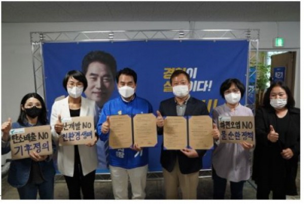 더불어민주당 백군기 용인특례시장 후보와 용인환경정의는 오늘(20일) 기흥구 신갈오거리 선거사무소에서 환경정책 협약을 체결하였다. 백 후보와 용인환경정의는 ▲난개발 대응 ▲기후 위기 대응 ▲물 순환 정책 등에 대하여 공동협력하기로 합의했다. 이를 위해 난개발과 기후위기에 대응하는 전담부서를 신설하고, 탄소 감축을 위한 대중교통 시스템 강화, 생태 중심의 하천 정비 등의 정책 마련과 실행에 힘을 모은다. 백군기…