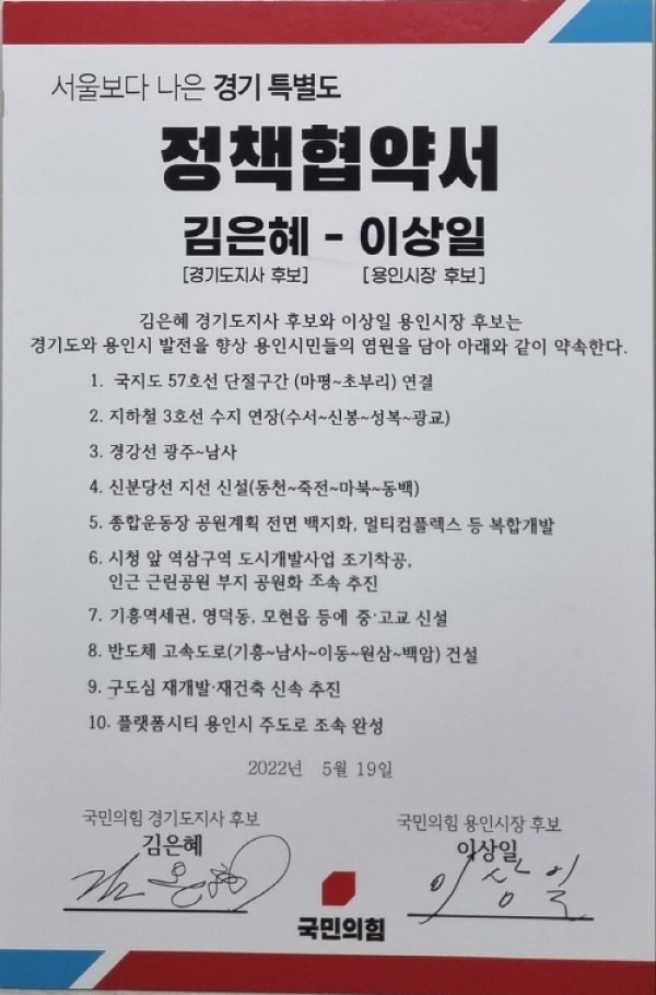 “용인특례시 발전을 위해 용인시민이 염원하는 10개 주요 사업을 경기도지사 후보와 용인특례시장 후보가 원팀으로 추진하겠다는 약속이다.” 정책협약서 국민의힘 김은혜 경기도지사 후보와 이상일 용인특례시장 후보는 19일 용인중앙시장 일대에서 열린 지방선거 합동 출정식에서 국지도 57호선 단절구간 연결 등 용인발전 주요 사업을 함께 추진한다는 정책협약을 체결한 데 대해 이같이 밝혔다. 시·도가 함께…