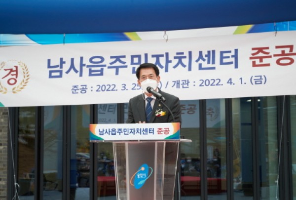 용인시 처인구 남사읍은 25일 행정복지센터 부지 오른편에 주민자치센터를 증축하고 준공식을 가졌다. 정식개관은 오는 4월 1일부터다. 용인시 처인구 남사읍은 25일 행정복지센터 부지 오른편에 주민자치센터를 증축하고 준공식을 가졌다.백군기 용인시장이 25일 처인구 남사읍 주민자치센터 준공식에 참석해 축사를 하고 있다 이날 행사엔 백군기 용인시장, 김기준 용인시의회 의장, 관내 38개 …