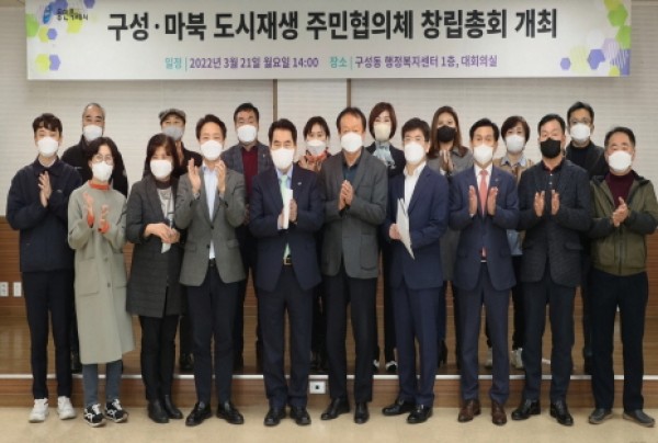 용인시 기흥구 구성‧마북동 일원 5만5031㎡에 추진되는 도시재생사업에 본격 시동이 걸렸다.백군기 용인시장이 21일 열린 구성 마북동 도시재생 주민협의체가 창립총회에서 참석자들과 기념촬영을 하고 있다. 용인시는 구성‧마북동 도시재생사업의 성공적인 추진을 위해 주민협의체가 창립총회를 열고 공식 활동을 시작했다고 21일 밝혔다. 주민협의체는 도시재생 뉴딜사업의 계획 수립과 사업 추진 과정에서 …