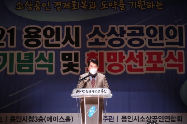 용인시는 20일 시청 에이스홀에서 ‘2021 용인시 소상공인의 날 기념식 및 희망 선포식’을 개최했다.백군기 용인시장이 20일 시청 에이스홀에서 열린 '2021 용인시 소상공인의 날 기념식 및 희망선포식'에서 축사를 하고 있다 용인시소상공인연합회가 주관한 이날 행사엔 백군기 용인시장, 이탄희 국회의원, 김기준 용인시의회 의장, 김연식 용인시소상공인연합회장, 지역 소상공인 등 100명이 참석했다.백군기…