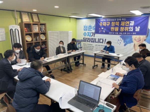 더불어민주당 정춘숙 의원(경기 용인시병·재선)은 12월 18일(토) 경기도 용인시 수지구 사무실에서 ‘수지구 정책제언과 민원청취의 날’을 개최했다. 주민들의 민원과 정책제안을 청취하기 위해 정춘숙 의원을 비롯하여 유영호 경기도의원(여성가족평생교육위·예결위), 김은주 경기도의원(교육기획위)과 윤원균 용인시의원(자치행정위원장), 장정순 용인시의원(문화복지위원장) 그리고 수지구청 산업환경과 장종찬 과장, …