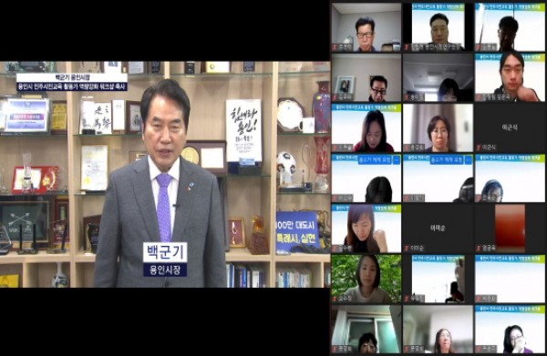 용인시의 민주시민교육 활동가들이 한자리에 모여 바람직한 민주시민교육의 발전방안에 대해 모색했다. 백군기 용인시장이 화상회의 앱인 줌으로 열린 '용인시 민주시민교육 활동가 역량강화 워크숍'의 참석자들에게 영상을 통해 인사말을 하고 있다. 용인시정연구원 용인시민주시민교육센터가 지난 18일 사회적 거리두기 강화 방침에 따라 화상회의 앱인 줌(ZOOM)으로 개최한 ‘용인시 민주시민교육 활동가 역량강화 워크…