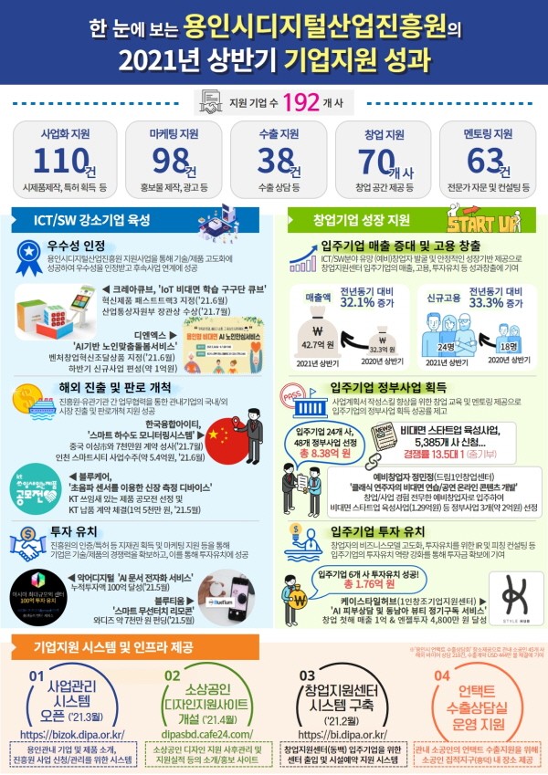 용인시디지털산업진흥원(원장 김윤석, 이하 진흥원)은 2021년 상반기 용인지역 디지털산업 진흥 및 ICT/SW 강소기업 육성을 위해 추진한 기업지원 실적과 성과를 발표하였다.진흥원 2021년 상반기 성과 요약 진흥원은 2021년 상반기 다양한 사업·프로그램을 운영하여 용인 소재 ICT/SW 중소기업 192개 사에 사업화 110건, 홍보·마케팅 98건, 수출상담 38건, 창업 지원 70개 사, 멘토링…