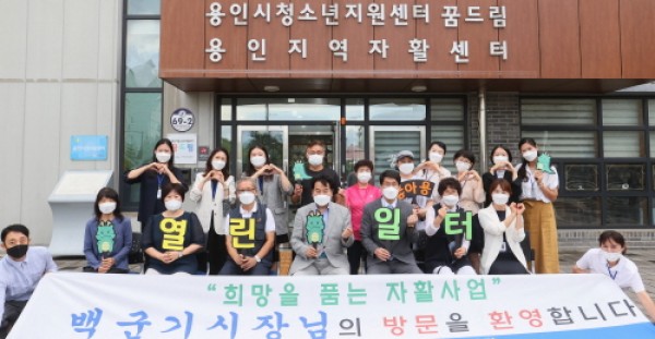 백군기 용인시장이 18일 처인구 삼가동에 위치한 용인지역자활센터를 방문해 종사자들과 자활근로 참여자들을 격려했다.백군기 용인시장이 18일 용인지역자활센터에 방문해 종사자 및 자활근로 참여자들과 소통하는 시간을 갖은 뒤 기념촬영을 하고 있다. 이날 방문은 코로나19 방역 수칙을 준수해 진행됐으며, 코로나19와 폭염에도 불구하고 자활근로사업에 참여하고 있는 참여자들과 센터 종사자들을 응원하고 애로사항을 …