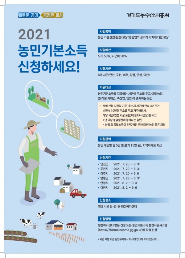 경기도는 오는 20일 포천시를 시작으로 도내 6개 시군에서 농민기본소득 신청 접수에 착수한다고 18일 밝혔다. 도는 9월까지 신청절차를 완료하고 10월부터 농민기본소득을 지급할 계획이다. 농민기본소득+포스터-+인쇄용_1 (1)농민기본소득은 다른 지자체의 농가소득지원과 달리 농민 개개인에게 지원하는 것으로, 도는 정부정책에서 소외되고 있는 여성 농민의 권리 강화에 전환점이 될 수 있을 것으로 기대하고 있다.농민기본소득은 농업생산…