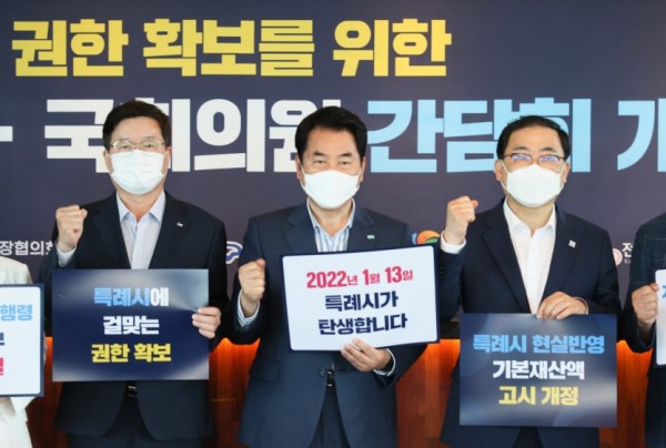 전국특례시시장협의회는 8일 목요일 서울 여의도 마리나 컨벤션센터에서 열린 특례 권한 확보 간담회에서 “특례시 권한 확보를 위한 성명서”를 발표했다.전국특례시시장협의회에서는 대표회장인 허성무 창원시장과 함께 이재준 고양시장, 염태영 수원시장, 백군기 용인시장이 참석했다. 각 지역구 국회의원으로는 고양시의 한준호 의원, 홍정민 의원, 이용우 의원, 수원시의 김진표 의원, 김영진 의원, 백혜련 의원, 용인시의 정춘숙 의원, 창원시의…