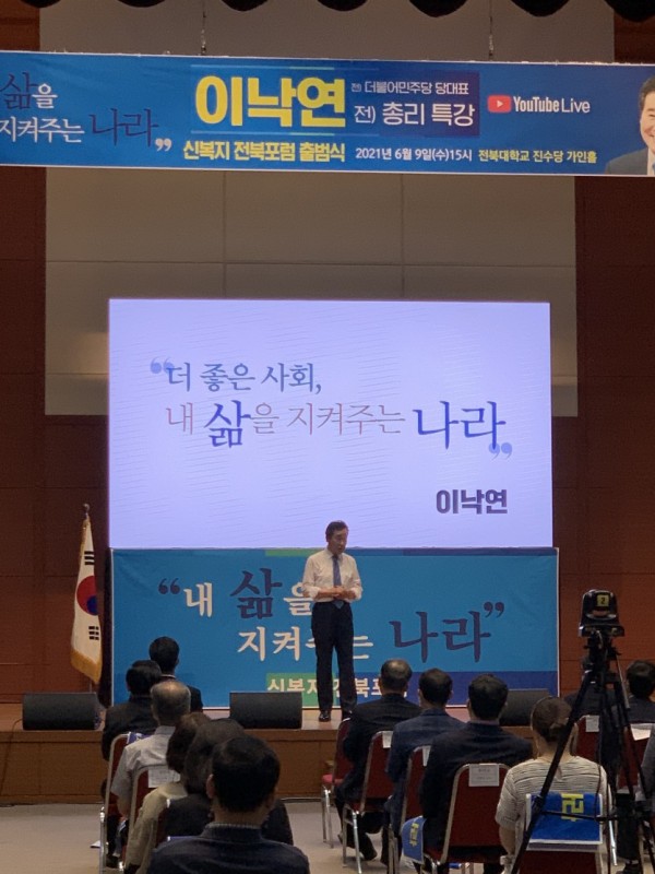 신복지, 중산층경제론, 한반도 신평화구상, 국민 기본권 개헌 등 내년 3월 20대 대선을 앞두고 정책 경쟁을 주도하고 있는 이낙연 더불어민주당 전 대표가 광주, 전남에 이어 전북에서 대규모 발기인이 참여한 신복지포럼을 출범시키며 전통적인 지지기반인 호남 지역 세 굳히기에 나섰다. 0609_신복지 전북포럼 출범식_1_이낙연 전 대표를 차기 대통령으로 당선시키기 위한 전북지역 지지모임인 ‘내 삶을 지켜주는 나라 -…