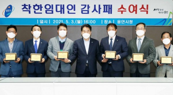 용인시는 3일 코로나19로 경제적 어려움을 겪은 소상공인에 임대료를 스스로 인하한 ‘착한 임대인’을 대표해 6명에 감사패를 전달했다고 밝혔다. 210503_스스로 임대료 인하한 착한 임대인 6인에 감사패 전달_사진이웃의 어려운 상황을 외면하지 않고 자발적으로 임대료를 인하해 지역사회 상생협력의 선례를 보인 것에 대한 격려 차원에서다. 시장실에서 진행된 이날 전달식에는 처인구 이익주씨, 기흥구 이창희씨, 수지구 …