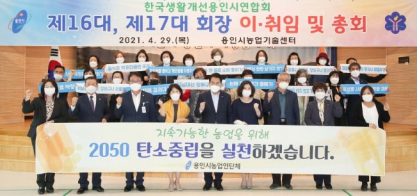 용인시는 29일 처인구 원삼면 농업기술센터 대강당에서 한국생활개선 용인시연합회장 이·취임식이 열렸다고 밝혔다. 한국생활개선 용인시연합회장 이·취임식 한국생활개선 용인시연합회는 여성농업인의 역량개발, 봉사활동, 농촌지역 탄소 저감을 목표로 14개 분과에서 400명이 활발한 활동을 하고 있다. 이날 행사에는 백군기 시장을 비롯해 박선주 제17대 신임회장, 제16대 김경자 회장 등 25명이 참…