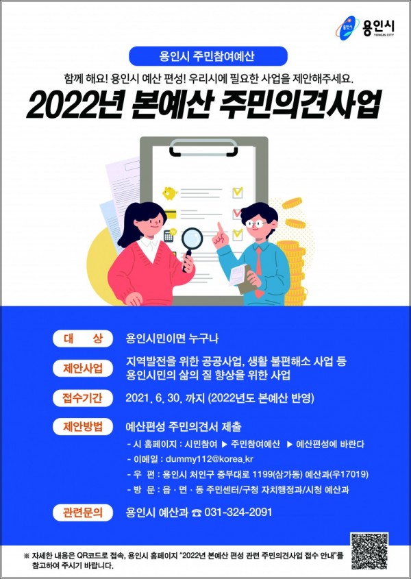 용인시는 5월1일부터 6월30일까지 예산편성 관련해 시민들에게 설문조사를 실시한다고 밝혔다. 용인시, 2022년 예산편성 시민 설문조사_2022년 본예산 주민의견사업 포스터 내년도 예산편성 방향과 투자 우선순위 설정에 시민들의 다양한 의견을 반영하려는 것이다. 설문조사는 5년간 우선 투자 분야 및 주민참여예산제 인지도 등 22개 항목으로 구성됐다. 시민, 관내 기관 또는…