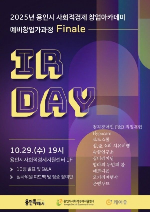 용인특례시(시장 이상일)는 오는 29일 열리는 ‘사회적경제 창업아카데미 파이널 IR 데모데이’에 참가할 ‘청중평가단’을 모집한다고 22일 밝혔다. IR데모데이 포스터.용인시사회적경제지원센터 주관으로 열리는 이번 행사는 사회적 가치 실현을 목표로 하는 예비 창업가들을 응원하고자 마련됐다.이번 행사에선 6개월의 창업 교육 과정을 이수한 예비 사회적경제 창업가 10개 팀이 비전과 사업 모델을 발표한다.센터는 일반 시민의 참…