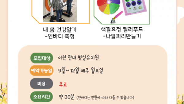 이천시(시장 김경희)가 지원·관리하는 경기도어린이식품안전체험관은 오는 9월부터 12월까지 관내 병설 유치원 원아들을 대상으로 ‘교실로 찾아가는 체험학습’ 프로그램을 운영한다고 밝혔다.9. 이천시 어린이식품안전체험관 병설유치원 대상 교실로 찾아가는 체험학습 운영 이번 프로그램은 체험관 방문이 어려운 병설 유치원 원아들에게 직접 찾아가 식품안전 체험교육을 제공하기 위해 마련됐다. 주요 교육프로그램으로…