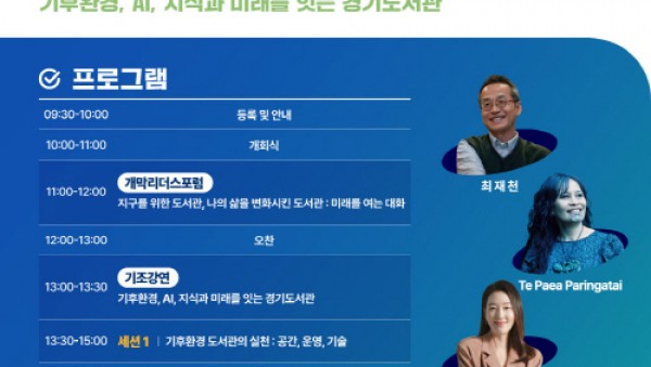 경기도와 경기도평생교육진흥원은 오는 23일 수원컨벤션센터 컨벤션홀3에서 ‘기후환경, AI, 지식과 미래를 잇는 도서관’을 주제로 ‘2025 경기도서관 국제콘퍼런스’를 개최한다.포스터(4)경기도서관 개관(10월 25일)을 기념해 마련된 행사에는 국내외 도서관 전문가, 학계 인사, 활동가, 도민 등이 참여해 기후위기와 인공지능(AI) 시대에 대응하기 위한 도서관의 역할과 발전 전략을 모색할 계획이다.개회식 이후 개막 리더스 포럼에…