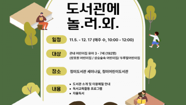 이천시(시장 김경희) 청미도서관은 오는 11월 5일부터 12월 17일까지 관내 어린이집 유아를 대상으로 도서관 견학 연계 프로그램 ‘도서관에 놀.러.와. 시즌2’를 운영한다.1. 이천시 청미도서관 도서관 견학 연계 프로그램 도서관에 놀러와 시즌2 운영 (1) 이번 프로그램은 유아들이 도서관을 직접 방문해 도서관 이용예절과 독서습관을 배우고, 그림책 읽기 및 만들기 활동을 통해 책에 대한 흥미를 높이는 기회…