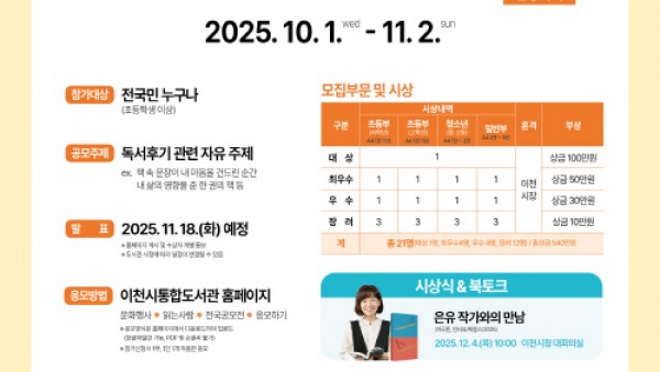 이천시(시장 김경희)는 10월 1일부터 2025 읽는 사람 전국 공모전 ‘이천이책, 당신의 읽는 하루’를 개최한다고 밝혔다.3. 이천시 전국 읽기자랑 2025 읽는 사람 전국 공모전 개최 이번 공모전은 독서기반 지역활성화 공모사업의 일환으로 추진 중인 ‘이천이책 읽는사람 챌린지’와 연계하여 책이 남긴 여운과 감동을 나누고, 그 안에 담긴 사람들의 삶을 조명하고자 기획됐다. 읽는 사람 전국 공모전은 책을 읽…