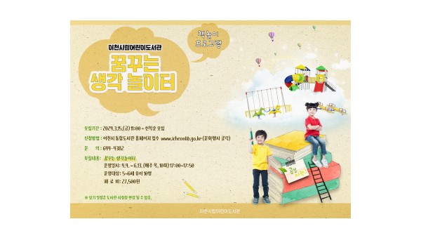 이천시어린이도서관은 이천시 거주 영유아를 대상으로 “꿈꾸는 생각 놀이터” 프로그램과 “신나는 영어 동화책 탐험대” 프로그램을 운영한다. 꿈꾸는 생각 놀이터.jpg꿈꾸는 생각 놀이터 프로그램은 다양한 주제의 그림책을 강사와 함께 읽고 독후활동을 함으로써 유아가 책과 친해…