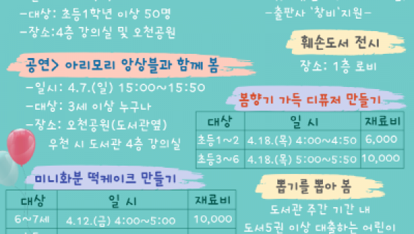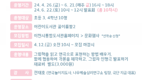 이천시(시장 김경희) 어린이도서관은 4월 26일부터 아동을 위한 참여형 독서 프로그램인 「우당탕탕! 그림책 연극놀이」를 운영한다고 밝혔다. 우당탕탕!그림책 연극놀이.png매회 그림책을 읽고 연극으로 표현하는 방법을 놀이로 배우며 익힌 후, 아이들이 직접 선정한 그림책을…