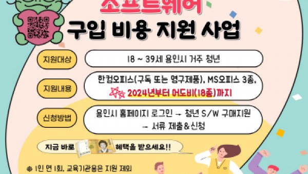 용인특례시(시장 이상일)는 청년들의 구직활동과 자기 계발을 돕기 위해 1인당 5만원까지 지급하는 소프트웨어 구입비 지원 대상 품목에 어도비(Adobe) 18종을 추가한다고 12일 밝혔다. 3. 용인특례시가 청년 대상 소프트웨어 구입비 지원 품목에 어도비를 추가했다.jpg…