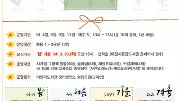 이천시(시장 김경희) 어린이도서관은 4월 6일부터 그림책 기반의 생태교실 프로그램인 「도서관에서 만나는 리틀 포레스트」를 운영한다고 밝혔다. 이천시립어린이도서관 도서관에서 만나는 리틀 포레스트.png사계절의 대표 그림책을 읽고, 숲에서 자연놀이를 통해 서식하는 식물들을…