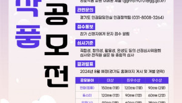 경기도가 인권신장을 위해 공헌한 ‘경기도민 인권 대상’ 후보자와 인권존중 문화 확산을 위한 ‘경기도 인권 작품공모전’ 출품작을 3월 15일부터 5월 31일까지 모집한다.포스터(경기도+인권작품+공모전)‘제3회 경기도민 인권 대상’ 후보자 추천은 경기도민 누구나 가능하며, 추천 대상은 ▲인…