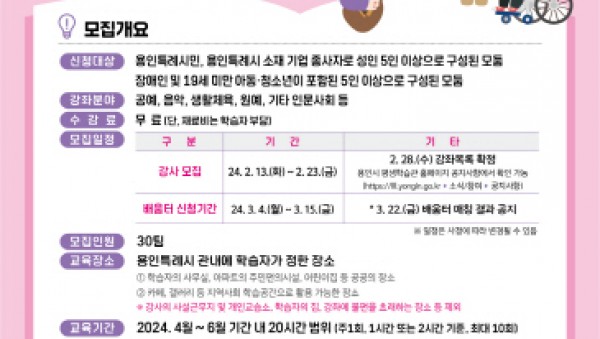 용인특례시(시장 이상일)는 다음 달 4일부터 15일까지 ‘2024년 상반기 온 시민 1강좌 배우기 운동’에 참여할 배움터를 모집한다고 16일 밝혔다.2024년 상반기 온시민 1강좌 배우기 운동 홍보물 ‘온 시민 1강좌 배우기 운동‘은 배움을 희망하는 시민이 있는 곳이…