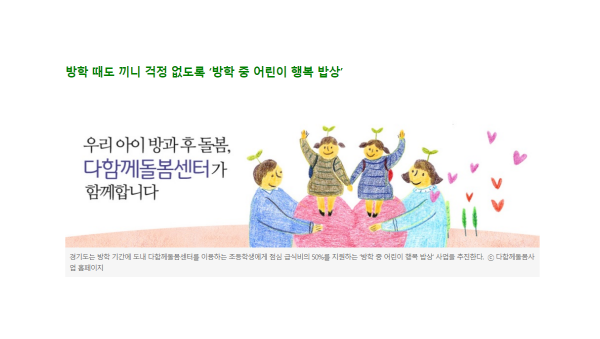 경기도, 방학 중 어린이 행복밥상 시행. 다함께돌봄센터 이용 아동에 중식 지원