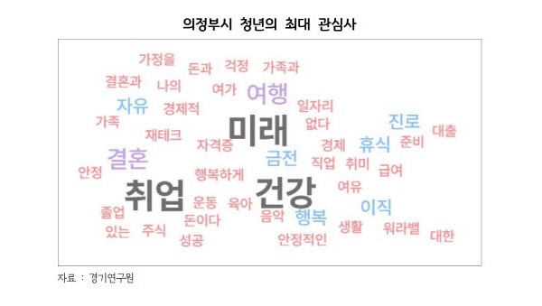 우리나라 청년정책을 추진한 지 10년을 앞두고 자치단체 청년정책 방향을 바꾸어야 한다는 의견이 나왔다. 의정부시+청년의+최대+관심사 경기연구원은 2023년 9월 20일~10월 20일 의정부시 거주 19~34세 청년 500명을 대상으로 인식조사를 실시한 ‘의정부시 청년…