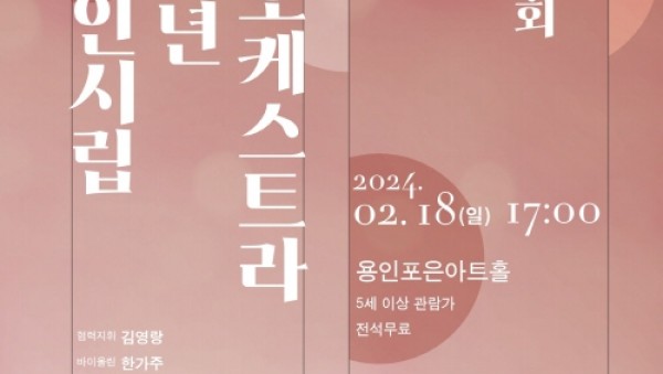 용인문화재단(이사장 이상일)은 오는 2월 18일에 용인포은아트홀에서 용인시립청소년오케스트라 ‘제35회 정기연주회’를 개최한다고 밝혔다. 제25회 용인시립청소년오케스트라 정기연주회 포스터용인시립청소년오케스트라는 2004년에 창단되어 용인특례시의 높은 문화 수준…