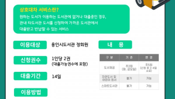 용인특례시(시장 이상일)는 시민 편의 증진을 위해 오는 15일부터 도서관 상호대차 서비스를 기존 주 2회에서 주 5회로 확대 시행한다고 12일 밝혔다.용인특례시가 15일부터 상호대차 서비스를 확대한다. 사진은 관련 포스터. 또 서비스 대상도 기존 23개 공공도서관에다…