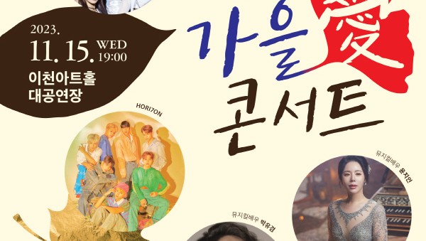 (재)이천문화재단(이사장 김경희)은 군 장병과 함께하는 이천 가을애(愛)콘서트를 오는 11월 15일 이천아트홀 대공연장에서 진행한다. 가을애콘서트이천아트홀 대공연장에서 진행되는 가을애(愛)콘서트는 드림 메이커 : 차세대 글로벌 팝그룹을 찾아라에서 선정된 7인의 차세대 …