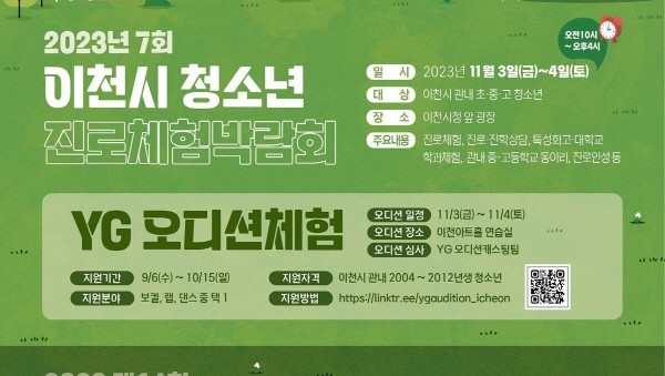 이천시청소년재단 이천시교육협력지원센터(이천시진로체험지원센터)는 오는 11월 3일(금) 이천시 관내 중·고등학교 청소년과 학교밖청소년을 대상으로‘2023 제14회 이천시청소년진로콘서트’를 개최한다. 진로콘서트는 이천아트홀 대공연장에서 오후 2시부터 4시까지 진행될 예정이다. …
