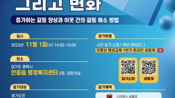 경기도평생교육진흥원은 11월 1일 평택시 안중읍행정복지센터 3층 대회의실에서 ‘2023년 경기도 민주시민교육 인식개선 포럼’을 개최한다.이번 포럼은 ‘증가하는 갈등 양상과 이웃 간의 갈등 해소 방법’을 주제로 생활 속 갈등 해결 사례를 공유하고 갈등 해결 방법에 대해 논하는 자리로, 참…