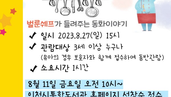 이천시(시장 김경희) 마장도서관은 8월 문화가 있는 날을 맞아 연계 공연 [요리조리 벌룬쉐프]를 8월 27일 운영한다. 요리조리-벌룬쉐프 포스터 이번에 운영되는 [요리조리 벌룬쉐프] 공연은 ‘요리조리 벌룬쉐프’가 들려주는 동화 이야기로 아이들에게 친근…