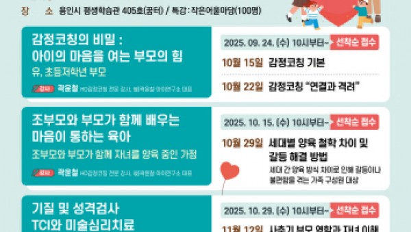 용인특례시(시장 이상일)는 부모의 자기이해와 감정 돌봄을 통해 자녀의 인성 발달을 지원하고, 가족 내 공감적 소통을 촉진하기 위한 ‘부모 공감 인성교육’을 10월부터 11월까지 운영한다고 24일 밝혔다. 용인특례시 부모 공감 인성교육 홍보 포스터교육은 자녀 교육에 관심 있는 부…