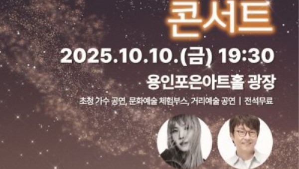 용인문화재단(이사장 이상일)은 오는 10월 10일(금) 오후 7시 30분, 새롭게 단장한 용인포은아트홀 야외광장에서 ‘가을 별빛 콘서트’를 개최한다. 이번 공연은 가을밤의 정취 속에서 시민들에게 특별한 추억을 선사하고, 용인의 대표 광장형 축제를 알리기 위해 마련됐다.[포스터]용인문화재…