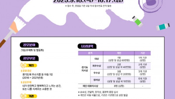 경기도와 경기도여성가족재단은 아동학대 예방의 사회적 공감대를 넓히기 위해 ‘제5회 경기도 우리아이지킴 콘텐츠 공모전’을 개최한다.공모전+포스터공모 주제는 아동의 4대 권리(생존권·보호권·발달권·참여권)를 바탕으로 한 창작 그림으로, 개인 부문은 ‘내가 안전하고 행복하다고 느끼는 순간’ …