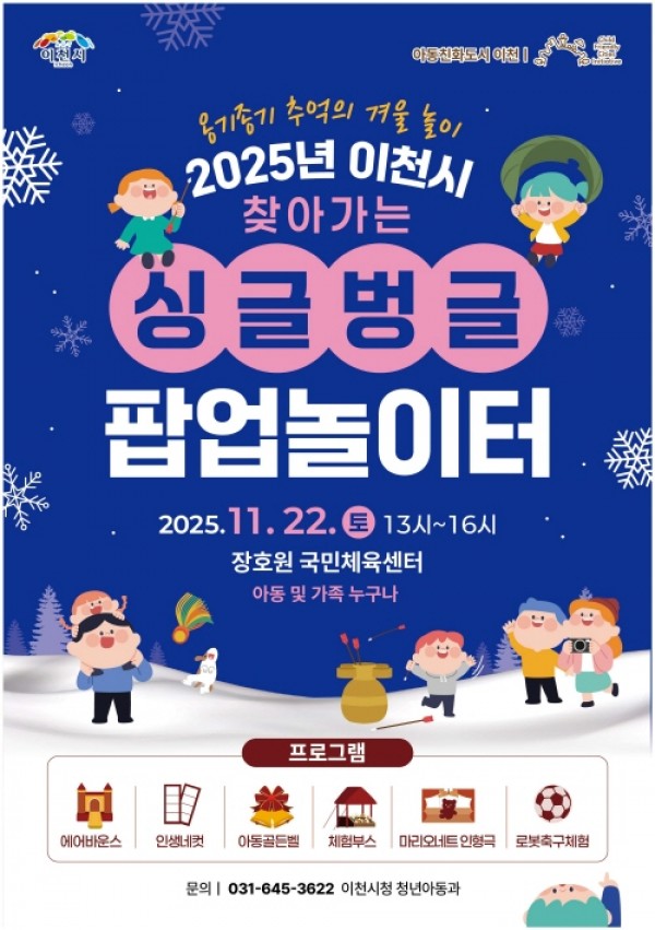 이천시(시장 김경희)는 아동친화도시 놀이문화 확산과 아동의 놀권리 보장을 위해 『찾아가는 싱글벙글 팝업 놀이터‘겨울놀이’』행사를 오는 11월 22일(토) 장호원 국민체육센터에서 개최한다고 밝혔다.찾아가는 싱글벙글 팝업놀이터 『찾아가는 싱글벙글 팝업 놀이터』는 계절별 콘셉트로 진행되는 가족 참여형 놀이문화 프로그램으로, 올해 총 3회로 개최된다. 지난 8월 1회차 ‘이천 CITY 바캉스’는 여름 물놀이로 성황리에 마무리…