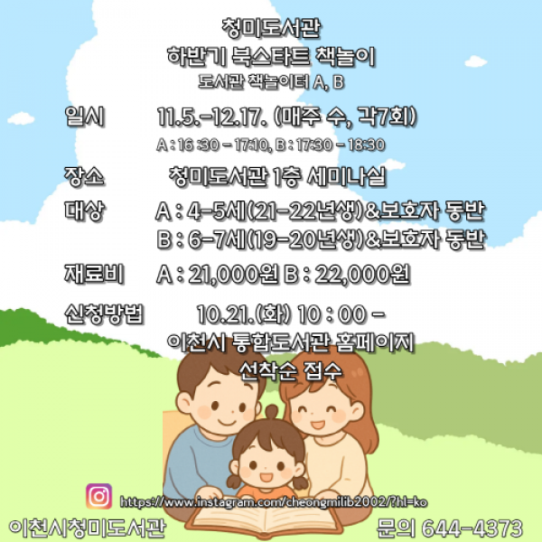 이천시(시장 김경희) 청미도서관은 오는 11월 5일부터 12월 17일까지, 유아와 보호자를 대상으로 ‘하반기 북스타트 책놀이’ 프로그램을 운영한다.4. 이천시립청미도서관 하반기 북스타트 책놀이 프로그램 운영 이번 프로그램은 아이들이 그림책 읽기와 다양한 놀이활동을 통해 책과 친숙해지고, 보호자와 함께 교감하는 시간을 마련하기 위해 기획됐다. 프로그램은 연령별 맞춤형으로 진행되며, ▲4세~5세 대…
