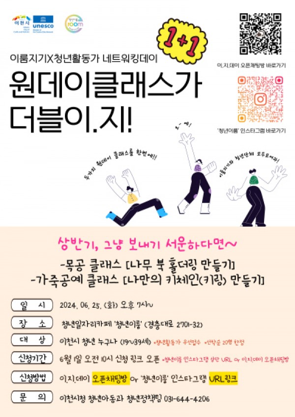 이천시(시장 김경희) 청년일자리카페 ‘청년e-room(경충대로 2701-32)’은 매월 이.지.데이(이룸지기의 날)를 정하여 비슷한 취미를 가진 청년들이 모여 함께 소통하고, 교류할 수 있는 기회를 제공하고 있다. 홍보지(이룸지기X청년활동가 네트워킹데이)▲클래식 음악 선율을 타고 온 봄(3월) ▲맨손운동으로 되찾는 청년건강(4월) ▲우리가족 케이크 한 조각(5월)에 이은 상반기 마지막 과정 ▲이룸지기×청년활동…