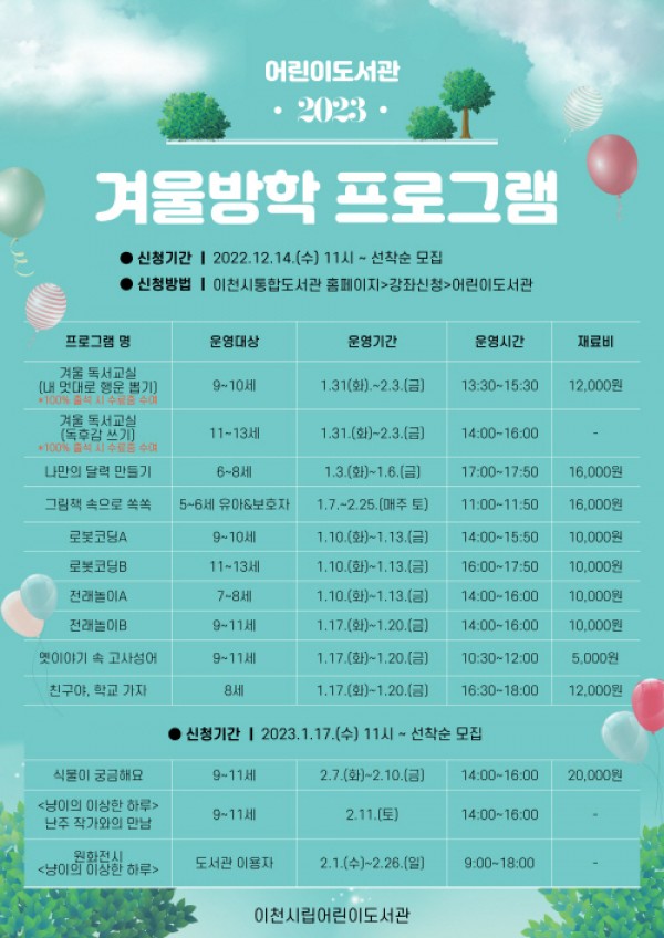이천시립어린이도서관은 2023년 1월 3일부터 2월 26일까지 유아와 어린이를 위한 겨울방학 프로그램을 운영한다고 밝혔다. 어린이도서관 겨울방학 프로그램이번 겨울방학에는 ▲겨울 독서교실(내 멋대로 행운 뽑기), ▲겨울 독서교실(독후감 쓰기), ▲나만의 달력 만들기, ▲그림책 속으로 쏙쏙, ▲로봇코딩A․B, ▲전래놀이A․B, ▲옛이야기 속 고사성어, ▲친구야 학교 가자, ▲식물이 궁금해요, ▲ 난주 작가와의 만…