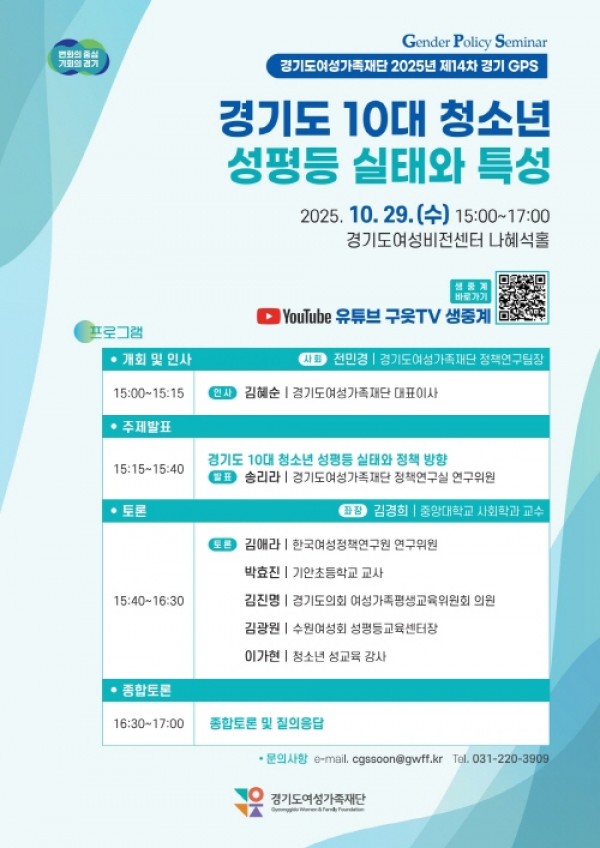 경기도여성가족재단이 29일 오후 3시 경기도여성비전센터에서 10대 청소년들의 성평등 인식 실태를 주제로 정책토론회를 개최한다.경기도+10대+청소년+성평등+실태+토론회+웹자보유튜브 생중계로 개최하는 토론회는 재단이 수행 중인 「경기도 10대 청소년 성평등 실태조사」 연구결과를 공유하고 향후 정책방향을 논의하기 위해 마련됐다.이번 실태조사 연구는 청소년기가 성평등 인식 형성에 중요한 시기라는 점에서 10대 청소년의 ‘성…