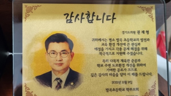 경기도의회 건설교통위원회 권재형(더불어민주당, 의정부3)의원은 지난 25일(목) 의정부 발곡초등학교 다목적 체육관 준공 및 학교 주변 도로 환경 개선에 공헌한 공로를 인정받아 발곡초등학교(교장 허일범) 학부모회로부터 감사패를 받았다. 권재형 의원, 발곡초등학교 학부모회로 부터 감사패 받아 이 자리에서 길정은 학부모회 회장은 “권재형 의원은 평소 열정적인 의정활동을 바탕으로 지역 발전을 위해 노력하…