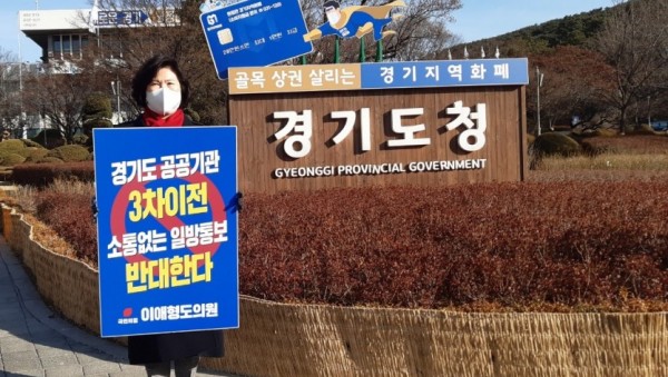 경기도의회 교육기획위원회 이애형 의원(국민의힘, 비례)은 2월 22일 이재명 경기도지사가 발표한 ‘경기도 공공기관 3차 이전 계획’에 대하여 반대 입장을 밝히며 오늘 경기도청 앞 정문에서 1인 시위를 펼쳤다. 210223 이애형 의원, 경기도 공공기관 3차 이전 반대 1…
