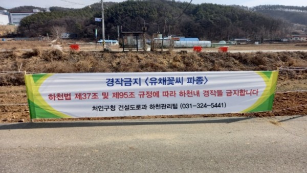 용인시 처인구는 오는 6월까지 관내 하천구역 내 불법경작 행위를 집중 단속키로 했다고 밝혔다. 불법경작 단속 후 유채꽃씨를 파종한 완장천 모습 시민들이 산책로로 이용하는 하천 내 불법경작 등으로 악취・쓰레기 관련 민원이 급증한 데 따른 것이다. &n…